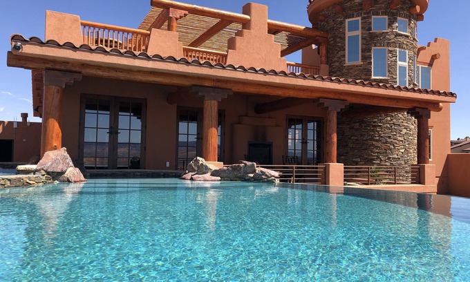 The NEWLY BUILT Kiva Cliff House is completed along with a custom pool and spa and including all brand new custom furnishings! On a cliff towering over Lake Powell, the Colorado River, Glen Canyon, desert plateaus, and majestic buttes, The KIVA CLIFF HOUSE epitomizes the spirit of the Land of Enchantment. This is not just a 'new listing' but a BRAND NEW HOME with 100% BRAND NEW FURNITURE and appliances. There is no other home like this! The Kiva Cliff House is a true southwestern designed home sure to immerse you in the native culture. From hand carved log posts and beams, to native style latillas, to the Kiva watchtower and the stone water features, this home embraces the beauty of the great circle. Enjoy the panoramic vistas and BBQ from the roof top patio, relax in the comfort of the custom designed Native American style furnishings in the living room or lower patio, read a book by the stone fountain off the private master suite or experience a romantic secluded outdoor shower spewing from a rock. The home is just minutes to both Wahweap and State Line Marinas at Lake Powell yet just blocks from restaurants, grocery stores and businesses in the heart of Page. Come and experience Spectacular Lake Powell and all of the adventures of the Grand Circle in comfort while enjoying the Native American ambiance of the great desert southwest.