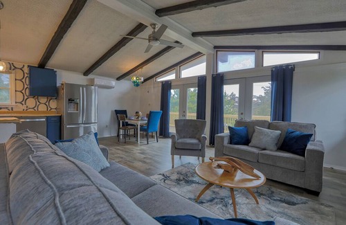 The upper level features 2 bedrooms and 2 bathrooms. A main living area with a fully equipped kitchen. Laundry area for your mid-stay needs. A large wrap-around deck with 2 seating areas for lounging, an area for outdoor eating, and a propane grill. . .