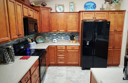 Walk in the front door to a nicely appointed and decorated large living room, dining room and a huge kitchen. Large screen TV with DVD player. Sliding glass doors open to a large screened in patio.
