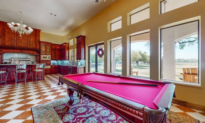 This elite haven offers an unmatched experience in a gorgeous Italian-designed castle with 11-inch concrete walls and custom glass fixtures from Murano. Boasting two separate vacation rentals and lavish amenities, this gated luxury property offers a unique stay on a horse and cattle ranch - schedule a time with the owner to learn about the inner workings of the barn.