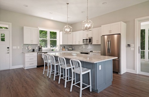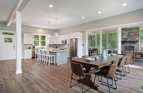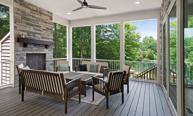 With indoor/outdoor living at its finest, adults can sip drinks by the gas fireplace on the screened porch while kids enjoy the bunk room, Wii, Smart TV, board games, and theater-style popcorn maker. Sleep like royalty in the three king bedrooms, curl up with a book by the vaulted wall of floor-to-ceiling windows, and enjoy the well-appointed kitchen with a nine-foot quartz island and separate beverage fridge. Make memories by swimming, roasting s'mores by the shore, and playing cornhole, bocce, or one of the other provided lawn games.