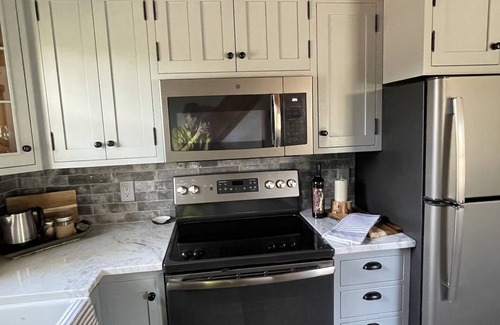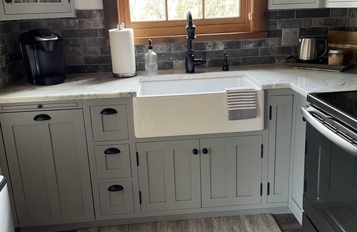 The Kitchen has beautiful custom cabinets, a farm house sink, and quartzite counter tops. It has all new appliances & amenities perfect for preparing your favorite meals.