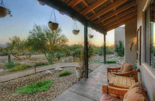 Custom Tucson Ranch Style Home situated on a lot just under 2 acres and breathtaking views! This is a 4 bedroom, 4 bathroom split floorplan with vaulted ceilings, polished concrete floors, views from living room with a cozy fireplace. The Gourmet Kitchen features Stainless Steel appliances, Custom Cabinets, granite and Steel counter tops. Relax under the large covered patio that offers Peace, Serenity, and great views. Events/weddings welcome with additional event fee, please contact host.