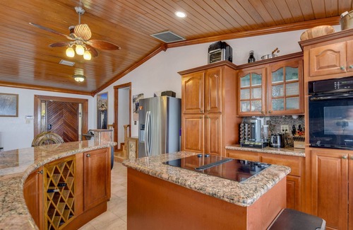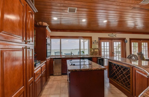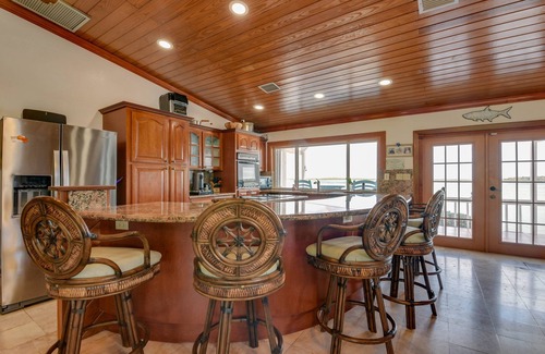 The property features a concrete dock that can accommodate up to a 26' boat, offering the best of both worlds in terms of views and boating. This luxury home boasts an open and inviting interior with abundant natural light, cool tile and hardwood flooring, and soaring ceilings. The fully equipped kitchen includes a beautiful granite bar top seating for 5 and an indoor dining table for 8. The spacious living room features an oversized, super comfortable leather couch, an additional separate seating area with a TV, and breathtaking views from the Open Water porch beyond. Whether you're seeking tranquility or excitement, Sapphire Sunsets promises an unforgettable experience.