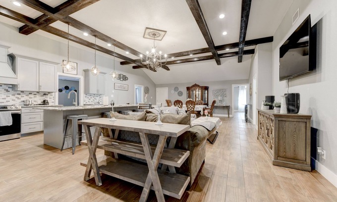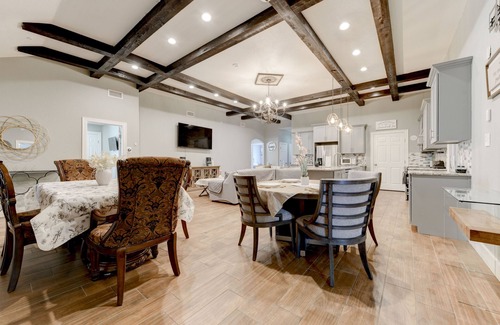 Enjoy the beauty of this home's cedar ceiling beams; its open & grand kitchen; it's spacious living room & dining areas. Plus this home comes with a huge backyard, 7 bedrooms 3 full bathrooms, custom designed kitchen. rustic home with a big backyard space for your next outdoor event. Each bedroom is spacious enough to accommodate 2 or more guests each room however parties are not allowed at this low nightly rate; strictly no smoking allowed Pets (house trained) are allowed with additional pet fee each. Book now your stay and enjoy your next unforgettable family get together.