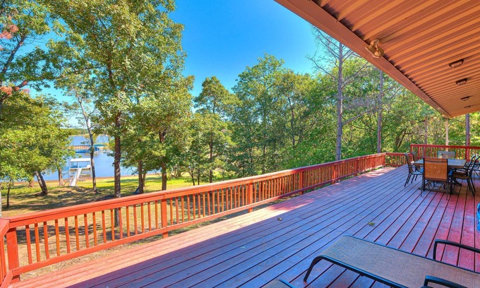 It is a fully updated cabin overlooking beautiful lake Eufaula! Enjoy great water views from large picture windows in living room as well as from two of the three bedrooms. Or walk out to the enormous deck and enjoy a coffee or glass of wine while taking in the views. Deer are frequently spotted from the deck. The home has three bedrooms, two full bathrooms, a bunk/game room and a large kitchen featuring granite countertops and double wall oven. Enjoy a long soak in either of the two bathtubs. You can bring your boat and tie it up in the boat dock all weekend. The kids will love jumping off the dock and swimming. The home is conveniently located five minutes off of Highway 69 and Texanna Rd. Come relax and enjoy all that Lake Eufaula provides!!