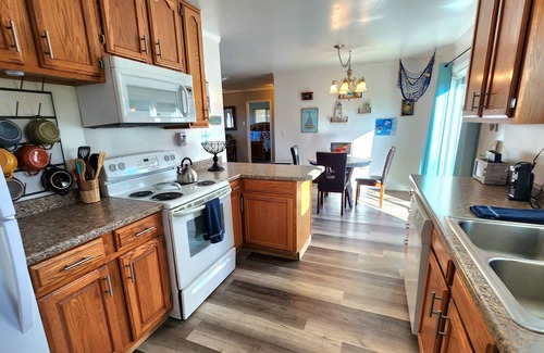 An open layout and spacious living area make for an easy relaxing spot in the house to gather together. Enjoy the large, mounted flat screen TV with basic cable connection and DVD player access for guest use; along with wifi. A smaller, open & well-stocked kitchen with all the cooking utensils you should need. Two dining areas; a 4 seated breakfast table and a larger dining table- seats 6.
