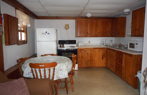 This cottage has been upgraded to be a year-round rental. It has a fully functioning kitchen, one 3/4 bath with a shower and 2 bedrooms that accommodate 4, plus a pull out sleeper sofa in the living room. The cozy living room is a perfect spot to read a book or catch up on your favorite TV shows. The cottage is equipped with a monitor heater fueled by propane. The wood stove can be used for heat, if necessary, with firewood provided. Cable TV is available. Maximum occupancy is 5.