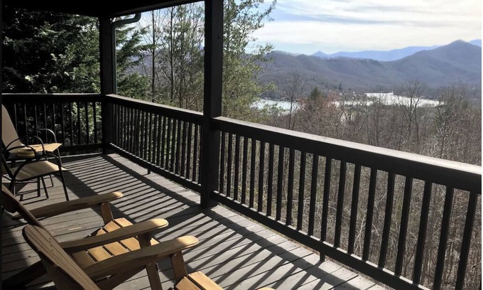 Bel Aire Bliss has a fantastic multi peak mountain view of the Chattahoochee National Forest from the living area and bedrooms of the home which is located in Hiawassee Georgia. The home features a wall of windows that provide a great view of the mountains of the forest as well as Lake Chatuge. Also view Brasstown Bald, the tallest point in Georgia. Enjoy sunsets every night! Relax on the covered deck with lounge chairs and a cool breeze. Sleeps 8 comfortably. The master bedroom is on the main floor with a king size log bed, recliner and streaming TV. The first floor full bath connects to the master bedroom. The second bedroom is upstairs and has a king size log bed, loveseat, and flat screen TV. The third bedroom is upstairs and has twin size beds and streaming TV. The upstairs has a full bath as well. The kitchen on the main level is fully furnished. In the living room has an electric fireplace, a large sofa with two built in recliners, and a loveseat with two built in recliners - 4 recliners total! Enjoy a late night movie or your favorite sport on the 55 inch Smart TV. On the deck just outside the living room you will find Adirondack chairs and two extra tall ones to have a different view. Enjoy the mountain ambiance while you have breakfast out on the deck. Outside, enjoy a nice fire in the fire pit while you take in the beautiful night sky! A charcoal grill is available for grilling your favorite foods. Play a game of ping pong downstairs. Ample parking is just out front and a few stairs with handrail bring you to the front door. One of the best things is, this home is just a short 1/2 mile drive on Hwy 76 to the middle of Hiawassee. Ingles Grocery with a Starbucks is about a mile away. The Georgia Mountain Fair ground is only a short 10 minutes down Hwy 76. We love the convenience of Bel Aire Bliss and have set it up to be nice and cozy for our guests.