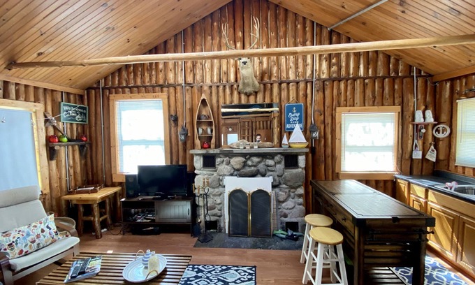 Super cute two bedroom cabin built in 1890. Very rustic and quirky, but full of charachter. Original stone fireplace, and adequate parking and lawn to spread out. Just a short walk to a public beach within the neighborhood, and a short 2 minute drive to downtown Charlevoix.
