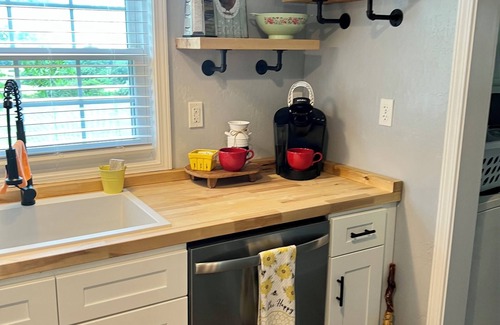 Keurig coffee pot, automatic ice maker, dishwasher, crock pot, griddle, waffle iron and cooking/baking pans for all your cooking needs. An electric grill as well as a small charcoal grill are also provided.