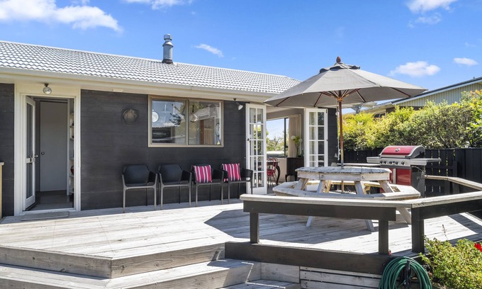 This Taupo holiday home includes open plan living, with a bright, family-friendly set up - the electric fireplace is perfect for those cooler days, or enjoy the easy outdoor flow for a fun al fresco living! The living area opens from both sides onto decking - well equipped for cruisy BBQs while the kids play in the yard. There's even a peek of the lake from the front deck!
