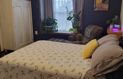 This studio apartment is completely private and quiet. Refrigerator, microwave, coffee pot and toaster oven. Comfortable, yet sun faded, easy chair and alarm clock with wireless charging sit next to the double bed.
