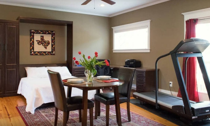 Quiet 700 sq. ft stand-alone studio located in the heart of the historic Houston Heights. Minutes from downtown and all that Houston has to offer. With wood floors, an abundance of natural light, full bathroom with shower and bathtub. Full kitchen with granite countertops and many essentials to stay in and cook. Desk and desk chair and wifi, perfect for getting some work done. Queen-sized bed, dinette with seating for two, couch, wardrobe, a chest of drawers offers plenty of storage, tv with antenna feel free to bring your own device to plug into the HDMI. There are two balconies that overlook the pool and hot tub. Treadmill, pool and spa are available to guests with 24 hour notice.