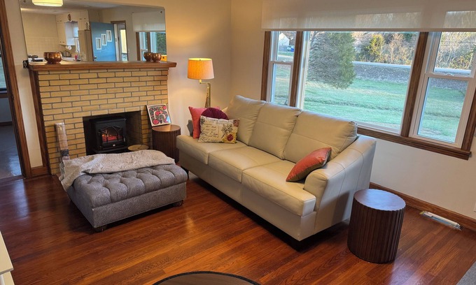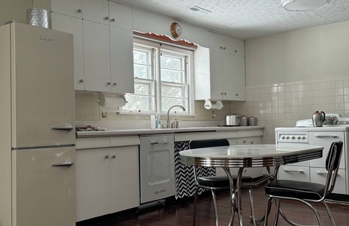 Consider this 1952 house your stylish retro home away from home while you and your pets flop down and relax in Knoxville. This marvelous property on 1 spacious private acre features 2 bedrooms...one with a king bed and one with a full bed. Each bedroom is perfect for a good night's sleep. With 1 full bathroom equipped with a hair dryer and a bathtub, you can freshen up and relax after a day of exploring. Enjoy the convenience of amenities like WiFi, an extra half bath, an iron, and a full washer + dryer during your stay. We look forward to welcoming you to our homestead. Only 2 miles to Interstate 40, puts you at a convenient driving distance to everything in Knoxville. Quiet central H&A for your comfort. It is so peaceful in the sunroom for reading. Unwind with your pets by walking them in the large front and back lawn. Plenty of space to spread out, put your stuff down, enjoy a snack or make a full family meal in the vintage 1950s kitchen, which is equipped with everything you need for snacking and sipping easy clean-up with a fantastic diswasher. Every type of plate or cup or cookware is at your fingertips in the well-appointed kitchen. Enjoy the side porch or covered back porch, perfect for conversations and chilling out.