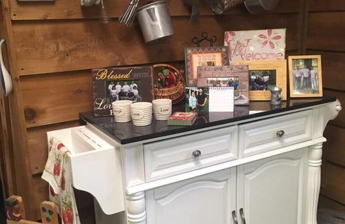 Cabin with 1 Bedroom, queen size bed, den with fireplace and sofa, has two recliners, has Central H/A, Dish TV & WiFi, dining area with sitting area with chair, large kitchen, microwave, fully furnished with dishes, Bunn coffee maker, toaster, crock pot, side by side refrigerator, electric range, pots & pans. Has coffee, creamer,, sugar, salt and lots of other notions. Full size bathroom with walk in shower. Closet to hang clothes in. Dinning and kitchen has ceiling fans. Towels & Sheets are furnished. Front porch for morning coffee and large deck in back with gas grill. Benches in front yard to sit under shade for a quiet relaxing day or evening.