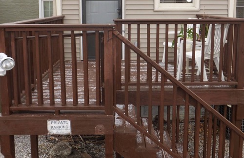More Info: Cute shotgun-style living. First level includes living space with comfy leather sofa and recliner, flat screen TV, soundbar, Chromecast, fun board/card games, eat-in kitchen with seating for six, fully-appointed kitchen with stove, stainless refrigerator, double-sink with disposal, dishwasher, dishes, glassware, flatware, cooking utensils, blender, coffee maker(new Keurig), toaster, even cookbooks with local favorites, plus full-size washer/dryer with provided detergent, umbrellas, iron & board, KY books. Local maps, brochures, restaurant suggestions, and more. Second level includes two bedrooms and two baths - master has queen bed with a Tuft & Needle foam mattress, black-out curtains, handmade chalk-painted oak furniture with plenty of storage, large closet, hangers, plus on-suite bathroom with combo shower/tub, cute black/white tile; second bedroom includes queen pillow-top bed, black-out curtains, antique furniture, and walk-in closet. Hall bathroom includes combo shower/tub, cute black/white tile. Each comes with plenty of towels, and travel size toiletries. Total sleeping - bedrooms for four people. Two private parking spaces in rear, with available street parking in front. Also includes back deck with seating and small covered front porch.