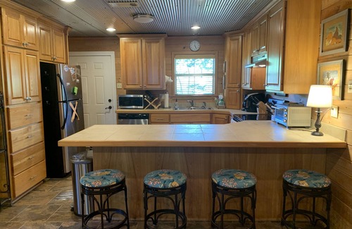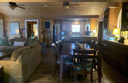 Our kitchen is well stocked with pots and pans, utensils and plenty of spices and basics if you run out. We have an electric smoker, gas grill and a charcoal grill on the deck which also has a table and chairs for 6. The deck looks out over the lake and leads out to our backyard and the pier and dock. There is a place to tie up your boat or jet skis but it is not inside the boat house. You can swim off the dock and we have steps into the water. We also have a green light for night fishing.