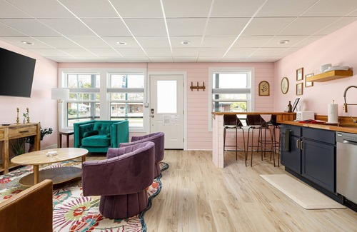 Step inside and feel instantly at ease. The living room features bold colors, velvet accent chairs, and a smart TV — ideal for winding down after a day of exploring. The full kitchenette is part of the living room space and includes all the essentials for prepping simple meals or quick snacks. This unit includes two private bedrooms:
