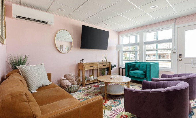 The living room features bold colors, velvet accent chairs, and a smart TV — ideal for winding down after a day of exploring.