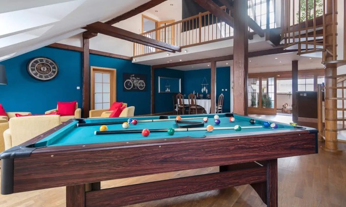 - spacious cozy living room, large dining table, armchairs, billiard table and high ceilings