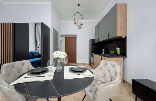 The apartment has been designed for guests who value design, functionality and comfort. This cozy yet well-planned interior combines elegance with a homely feel, creating a welcoming space ideal for couples or solo travelers. The main living area features a fold-out sofa that serves as a stylish seating spot during the day and transforms into a comfortable bed at night. Nearby, a round dining table with soft chairs invites you to enjoy romantic breakfasts or evening meals. The kitchenette is equipped with a modern induction hob, oven, fridge with freezer and electric kettle. You’ll also find a full set of dishes and cooking utensils, allowing for convenient meal preparation. In the living area, a Smart TV with cable channels and access to streaming platforms lets you unwind with your favorite shows. Fast Wi-Fi ensures seamless remote work or contact with loved ones. The bathroom impresses with elegant finishes – dark accents, a large mirror and a spacious walk-in shower create a harmonious atmosphere. Guests are also provided with a set of toiletries, a hairdryer, drying rack, vacuum cleaner, iron and ironing board – everything needed for a comfortable stay.