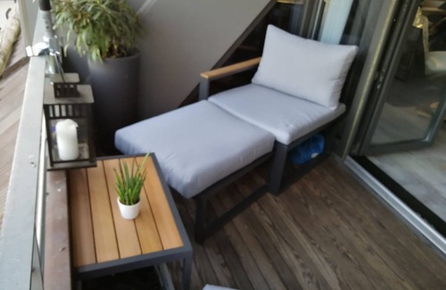 Relax on the balcony (enjoy the outdoor furniture!) of this apartment. As for the great indoors, you can come inside and enjoy the free WiFi and cable/satellite TV.