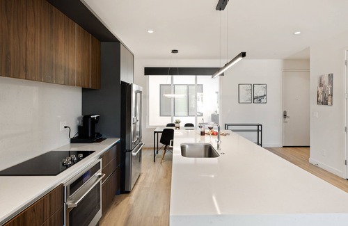 Step into an open-concept living area featuring modern furnishings, a Smart TV, and a pull-out sofa that converts into a Queen bed for two additional guests. The fully equipped kitchen boasts high-end Cafe appliances, a large kitchen island with bar seating, and a dining table for four. Enjoy your morning coffee on the private, expansive balcony with outdoor furnishings.
