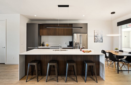 Upstairs, you'll find two luxurious bedrooms, each with two Queen beds, a spacious walk-in closet, and a Smart TV. Both bedrooms have their own ensuite bathrooms with modern amenities. The primary bathroom features a stand-in shower, while the second bathroom offers a shower/tub combo.
