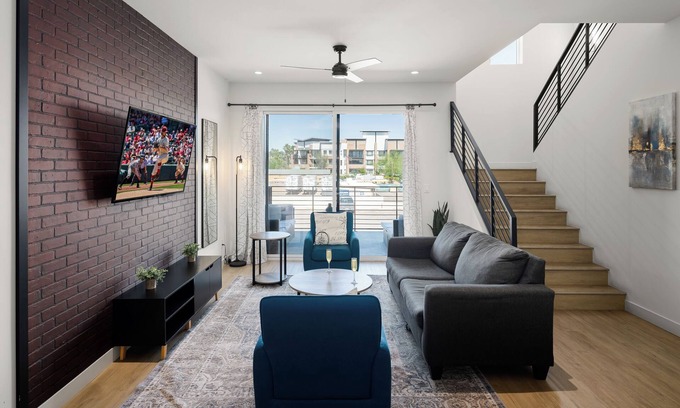 Escape to Daily Doze in Old Town Scottsdale. This modern, two-story condo offers an open-concept floor plan, high-end Cafe appliances, and a private expansive balcony. Enjoy two bedrooms with ensuite bathrooms, Smart TVs, and plush Queen beds. Relax in the communal clubhouse or outdoor patio with a hot tub, BBQ grill, and putting green. Secure parking and a prime location make this the ideal getaway.