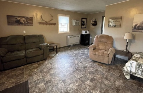 Youve landed in Dakota territory! Come on in and cozy up in our newly remodeled cabin. It has 2 full beds, 1 twin bed, and living area with couch and recliner! It is fully stocked with coffee and tea. This cabin has a mini fridge, microwave, coffee maker, air conditioning/heat, a full bathroom, shampoo/conditioner/soap, towels, linens and a smart TV to stream all of your favorite shows and movies! Make sure to like and follow our facebook page for updates and last minute openings! https://www.facebook.com/profile.php?id=61550591985610&mibextid=LQQJ4d