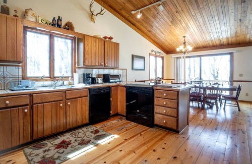 The charm of a classic cabin with the advantages of modern, open concept living. Dancing Bear is the just right place for you next family gathering. In the main living area enjoy vaulted ceilings, floor to ceiling windows over looking the private, wooded lot and a stone, wood burning fireplace. Gather around the dining table or go casual and sit at the kitchen bar. Rustic finished floors and wood lapped ceilings add more to the warmth of the home. A separate mudroom is the perfect place to drop ski or hiking gear. On the main level is a large master king bed suite with en suite and private deck.