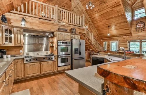 Stay connected with Starlink high-speed internet, relax in the spacious living areas, or step outside to enjoy the flagstone patio with a bubbling hot tub, ideal for unwinding after a day of exploring. The cabin is also wheelchair accessible with two ramps, wider doors, and a main-level living area designed for easy one-level living. Whether gathering with loved ones, cooking gourmet meals, or soaking under the stars, this secluded cabin blends luxury and nature in perfect harmony.