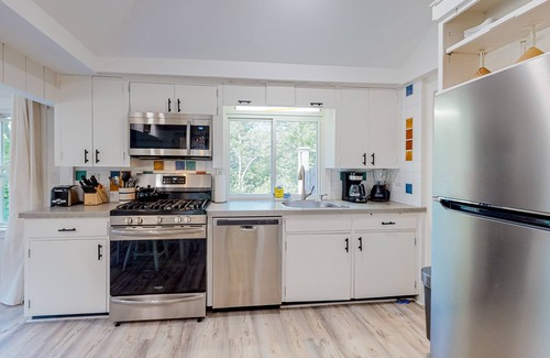 Inside, the single-level living space is breezy and bright, with picture windows bringing in the natural setting on three sides. Use stainless steel appliances to prepare meals in the airy kitchen, set up after-dinner board games at the dining room table, and spend the evening hours streaming movies on the living room TV. As the day's swimsuits spin in the washer/dryer, you'll get a restful night's sleep in the bedroom and the open sleeping nook on one side of the living area.