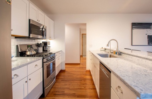 Entering the great room, the exquisite A-frame structure is decorated with picture windows allowing for you to enjoy lake views sun up, to sun down. Entertaining friends and family alike is a breeze with this open floor plan! An open kitchen with contemporary white cabinetry and granite counter tops will make the chef of your group burst with happiness. A voluminous supply of cooking and eating ware is all you need to feel like the “hostess with the mostess,” while making meals and memories with your favorite people. Don't forget that Finger Lakes wine goes with everything!