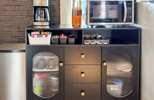 Fully stocked and ready to cook: dishwasher, stove, fridge, microwave, and all the pots, pans, dinnerware, flatware, and glassware you need. There's even kids' dishware, a coffee bar with 2 sugar options, hot cocoa, and a kettle. Dine in style at the table for three.