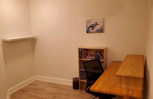 An extra room with a desk in case you need to work. A large garage and a screen in patio area.