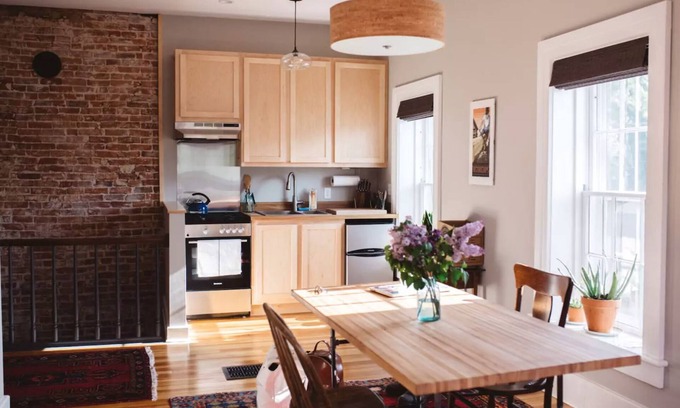 The space is bright and full of natural light, and sits perched overlooking the Oneota Valley. The unit consists of a large living area with adjoining kitchen, a spacious bath, and large bedroom. The bedroom has a queen bed and there's a queen size blow up mattress to accommodate a third or fourth person. Paul has restored old buildings going on fifteen years. He eats, sleeps and breaths old buildings, architecture and design. We've put so much work into making the space just right, and we think you'll agree.