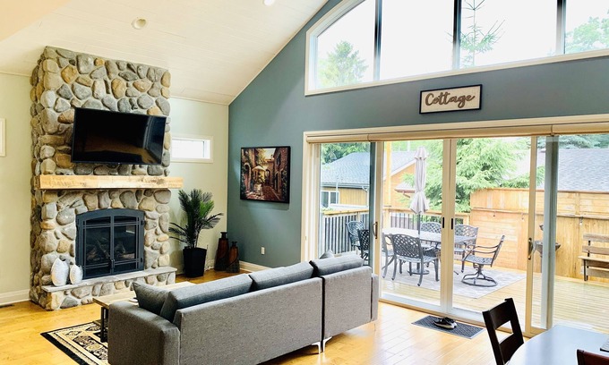 All the comforts of home at our beautifully decorated, modern cottage in the heart of Grand Bend. Our cottage is spacious and fully furnished with floor to ceiling patio windows, vaulted ceilings and an enchanting cobblestone gas fireplace.