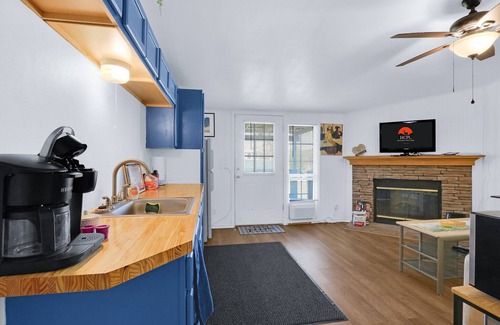 Step inside, and the interior unfolds into a haven of comfort and style. The open living space invites you with its cozy seating, adorned with an electric fireplace and a television, offering the ideal retreat after a day of exploration. The kitchenette, equipped with a fridge, toaster oven, and microwave, and two burner hot plate allows guests to prepare simple meals or snacks. When the day winds down, retire to one of the two bedrooms for a restful night's sleep. The first bedroom boasts a queen bed, while the second bedroom features a full bed and a twin-size futon. The adjacent full bath, complete with a shower/tub combo, adds a touch of convenience and luxury to your stay. Whether you're on a romantic getaway or a family retreat, Deep in the Heart of Texas ensures a comfortable and memorable experience.