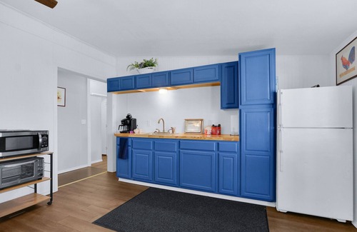As you approach the bright blue cottage, the inviting front porch becomes a prelude to the leisure that awaits you. Picture yourself sipping a morning coffee, basking in the hill country air, and letting the everyday worries fade away. The porch, a private sanctuary, sets the stage for a slowed-down pace of life.