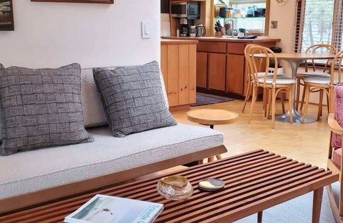 Deepwater Point is a mid-century modern retreat ideal for horse show stays or summer escapes. Skylights flood the home with light, complementing a wood fireplace, large family room, and deck with bonfire pit. The king bedroom has a coffee bar, the second bedroom a queen and storage, plus twin futons for extra space. Side-lot parking fits a motorhome or trailer. A wooded path leads to a shared beach. 30-night minimum stay.