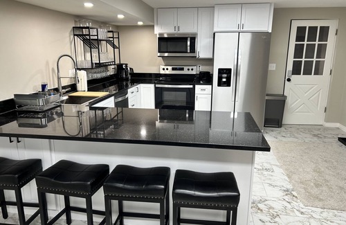 Kitchen bar seating for 4 and dining room table area seats 6. Double door fridge with kitchen ice maker and water dispenser. Dishwasher, glass top stove and microwave. Includes drip coffee maker, electric water kettle, toaster and Instapot.