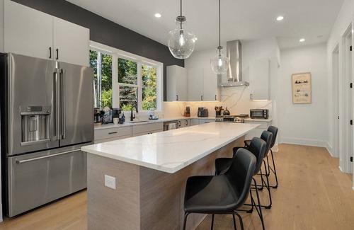 Inside, you’ll find three beautiful king suites, two are located on the entry level and one on the upper level, all offering privacy and relaxation. The main level suites feature a charming king guest bedroom with shared bathroom access, ideal for additional guests. On the lower level, a cozy bunk suite provides a fun and comfortable sleeping arrangement, with a queen bed and two twin bunks overhead. The primary suite, located on the entry level, boasts a luxurious stand-alone tub and separate shower, offering a spa-like experience, while the other bathrooms are equipped with modern showers only.