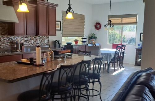 This spacious open concept 3 bedroom home is perfect for groups to sit back and enjoy Arizona. The backyard garden attracts various birds and critters with the sounds of the running fountain. There are 2 separate living room areas which is perfect for multiple families or couples wanting to share a place, but have their own space. Each living room has a large flat screen TV with internet TV and plenty of comfortable leather seating.