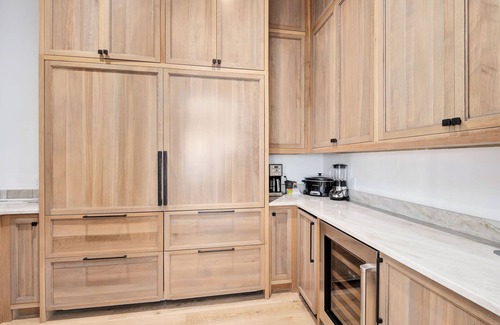 Designed for culinary enthusiasts, the chef's kitchen is adorned with top-of-the-line Wolf appliances, Sub-Zero refrigeration, quartzite countertops, and custom cabinetry. A butler's pantry provides additional storage, prep space, wine storage, and a dishwasher for effortless entertaining.