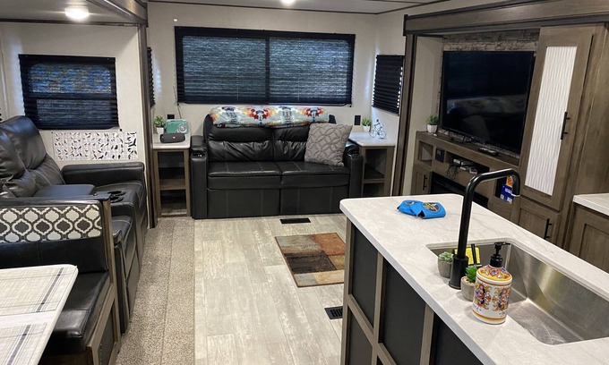 Reconnect with nature at this unforgettable escape. This cute little RV is located on Spider Mountain bike park, and has an on site pizzeria and bar! It contains 1 bedroom with a queen bed, full kitchen, and bathroom with stand up shower. The couch pulls out into a smaller sized bed suitable for younger children, and both recliners lay out flat for maximum comfort! Try the hiking/biking trails on Spider Mountain, then hit up the bar for some live entertainment on the weekends! *Having said all this, you are renting an RV. If you have never stayed in an RV this may not be the rental for you. :)