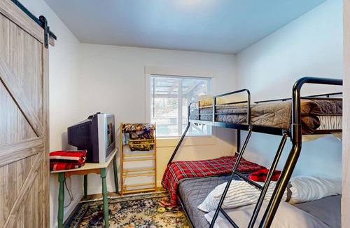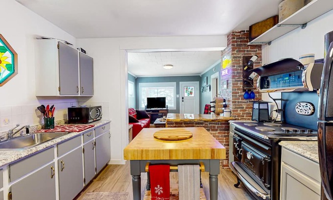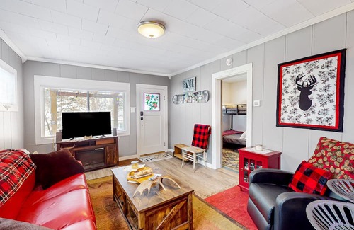 After a day on the mountain, come back home to kick back and relax on the plush sofa or whip up a hearty dinner in the stylish, full kitchen. Plenty of natural light, comfy furniture, and colorful ski-themed decor create the perfect backdrop for gathering with great company. Swap tales from the mountain or play board games together at the dining nook. As golden hour approaches, utilize the private washer/dryer for any gear, then share some local brews on the front porch while watching the sun dip below the treeline.