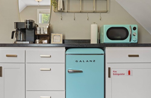 This upstairs suite features two bedrooms, a bathroom, and a welcoming living room with a small kitchenette equipped for your convenience. The kitchenette includes a 3 in 1 stove coffee grill toaster oven, mini-fridge, microwave, crockpot, & toaster. Bedroom 1 boasts a king-size bed, while Bedroom 2 offers a full-size bed and a twin-size bed, perfect for accommodating families or groups of friends. Children over 10 are warmly welcome. Additionally, guests can access the shared laundry room for added