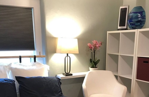 303 W. Crawford is a downtown high-security three-bedroom, one bath two-story apartment (kitchen, dining room, living room down with three bedrooms and bath up): two medium-sized bedrooms (a little over 100 square feet each, with full size beds) and one large 188 square foot bedroom (with queen bed). Each includes a desk and chairs. The common areas (living room, dining room, kitchen and bath) total about 700 square feet. The attractively decorated unit is completely furnished and equipped. Pets and smoking are not permitted. Professionally cleaned.